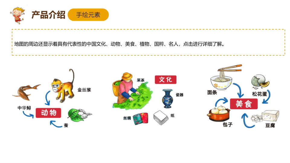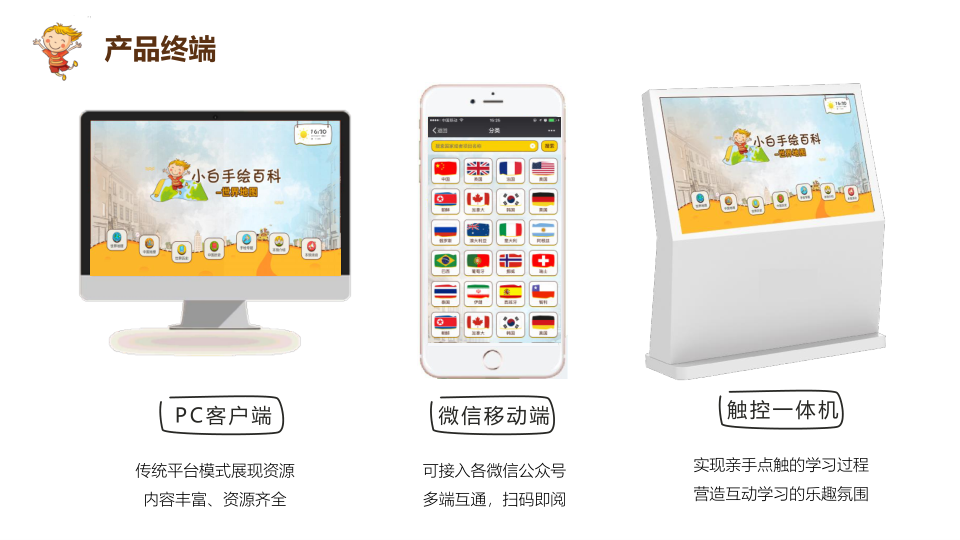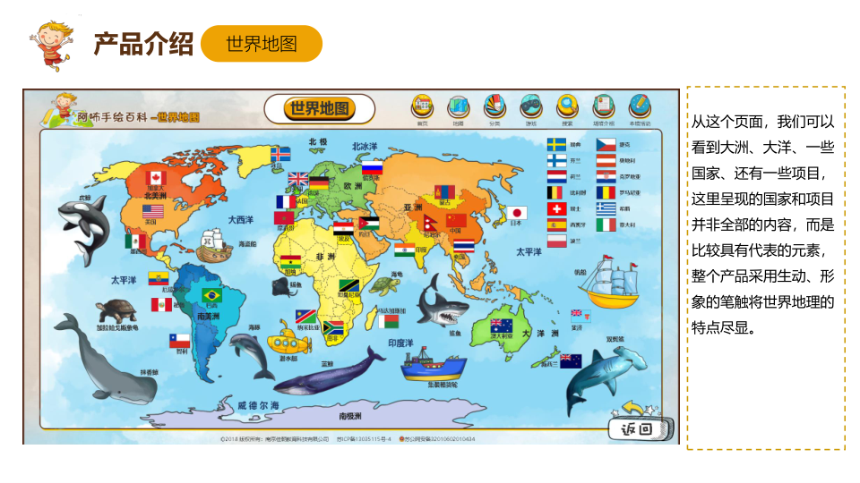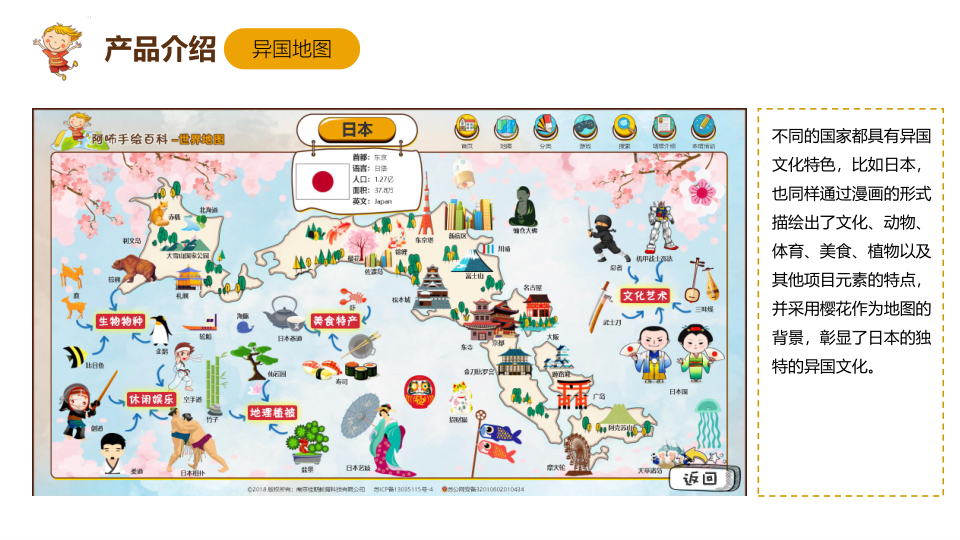 手绘地图百科针对各类人群,在页面呈现上,采用动画技术,使地图的展示活灵活现,增加了学习的趣味性和生动性。不仅如此,PC、触控一体机、微信公众号相结合,多终端服务,满足各类人群的学习场景,为用户提供更完善的学习方案,内容涉及到亚洲、欧洲、北美洲、南美洲、非洲、南极洲、大洋洲7大洲,42个国家的城市、名人、名胜古迹、动物、植物、娱乐项目、特产等详细介绍。