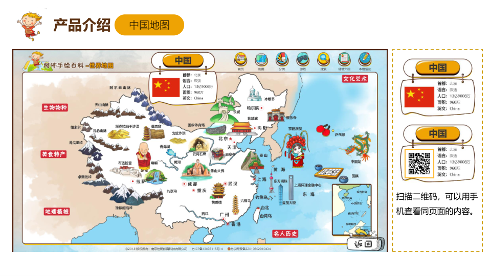 手绘地图百科是一款涵盖全世界各个国家信息介绍的产品。无论是各国城市、名人、名胜古迹、动物、植物,还是娱乐项目、特产等尽在于此。平台采用最轻松的学习方式、最吸引用户注意力的页面样式,深度解读全世界各国风采。不仅如此,平台资源内容和产品服务结合,不仅为图书馆提供资源内容,也为广大读者提供更便捷的学习渠道。